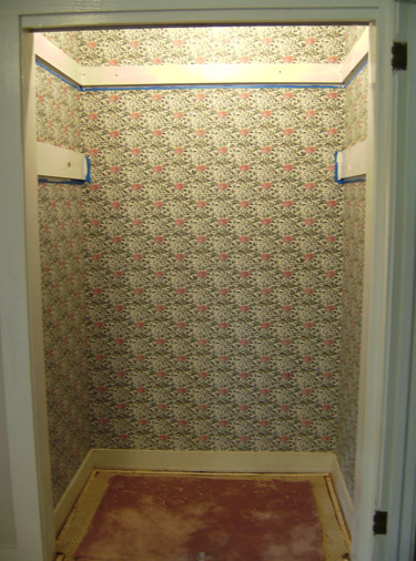 Oh, and just for fun? Here’s our master bedroom closet. There’s no way we were going to touch that wallpaper… it needs to be preserved for posterity, even if posterity wants nothing to do with it. This is for posterity’s own good.