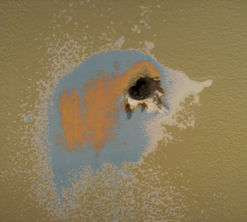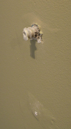 The worst section was the part with the dozen drywall anchors. Best guesstimate based on placement is that the anchors held some shelves. When the shelves came down and the new paint went up, someone slapped a thick coat of spackle over the anchors and called it good. Admittedly it’s not an epic kludge, but it is still saturated with rich chocolaty kludginess.
