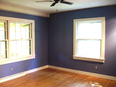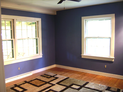 The color is Behr’s “Laguna Blue.”  I went with a darker color to hide the flaws in the drywall and this blue covers them very well – you can’t even see the spots where I dug out the old drywall anchors with a utility knife.  All in all, I’m not a hundred percent with the way the room turned out (especially when you consider the ceiling), but the repairs, fan and lights, carpet, and new paint came in under budget so that’s good.
