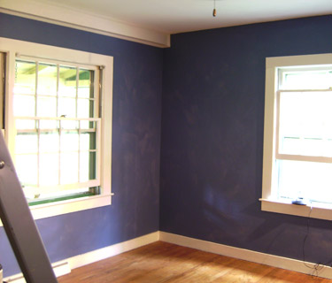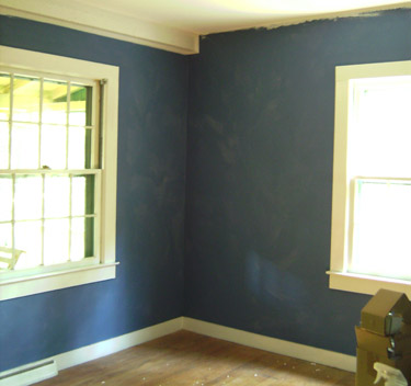 First coat of paint applied with brush pad, and ceiling has been trimmed and rolled. Photo was taken mere moments before the ceiling started to crumble into dust-paste.