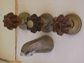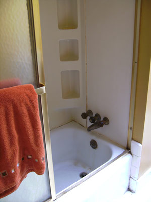 The one repair to the bathrooms that we might go ahead and knock out is the shower wall in the large bathroom – it’s all kinds of mightily disgusting in there. We had planned to remove the tub and replace it with a tiled shower floor, but the tub is cast iron and was built into the bathroom before the walls went up. Removing it will be far more trouble than leaving it and just fixing the shower surround. And, if we get lucky and they don’t have to carve through three feet of 50s-style cement and mudboard to find the pipes, we might be able to get the surround replaced on budget.