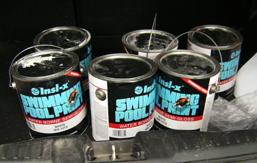 Anyhow, I read some (mostly very positive) reviews of their pool paint, then got in touch with the seller who offered me six new cans at below wholesale. A Sensible Craigslist Transaction Process (public parking lot on a busy street in broad daylight) later, I drove off with enough paint to do two nice, thick coats on the pool. The seller was a great guy. He showed up in a huge red F-150 and said he was in the business of buying construction products from companies who couldn’t sell them but couldn’t write off the loss. We chatted for a few minutes about how we were sad the burger joint we had parked at had closed, and how he had enjoyed coming there with his son. He took my check, I took his paint, good feelings all around.