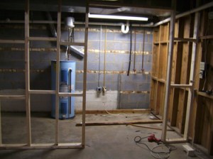 We’ve got plans to move the washer and dryer hookups when we do the full plumbing/rewire five years down the road, but between now and then they’ll stay where we found them. After finishing the shelves in the Labyrinth, Eli grabbed a couple dozen 2x4s and a bunch of sheetrock, then started the framework for a 12×8 laundry room. The room has been framed and is only half-done, and already it is a huge improvement. I need to see what North Carolina defines as being a finished (aka: “taxable”) room before she puts up a ceiling, but some shelves and a laundry folding table are definite.
