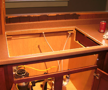 Brown turned off the water, removed the plumbing and disposal, and ripped out the old sink.  I took off the trim, painted the boards behind the sink, and scraped up the old caulk with a razor.  Then I ran a bead of new caulk around the edge of the sink; the clear caulk vanished in the move so I had to use biscuit, and when I ran the bead I dropped it into the cavity to keep the color from bleeding out under the edge of the sink.