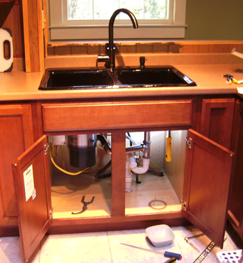 Brown then installed the new sink.  It’s a Kohler cast iron monster.  He went through the box a couple of times to find the clips that keep the sink attached to the counter and fixed in place, then realized that clips aren’t needed as an eighty-pound sink isn’t going to wander when someone chucks a pan in it.