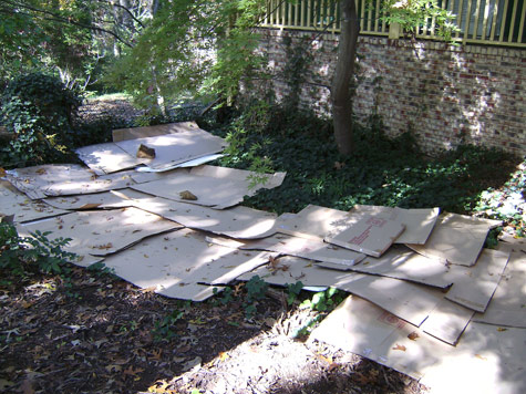Since we just moved, we have a metric ton of Styrofoam hard packing sheets and cardboard boxes. These were layered over the ivy to keep out light.