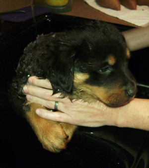 Zu in sink. Most convenient Rottweiler bathing experience EVER.