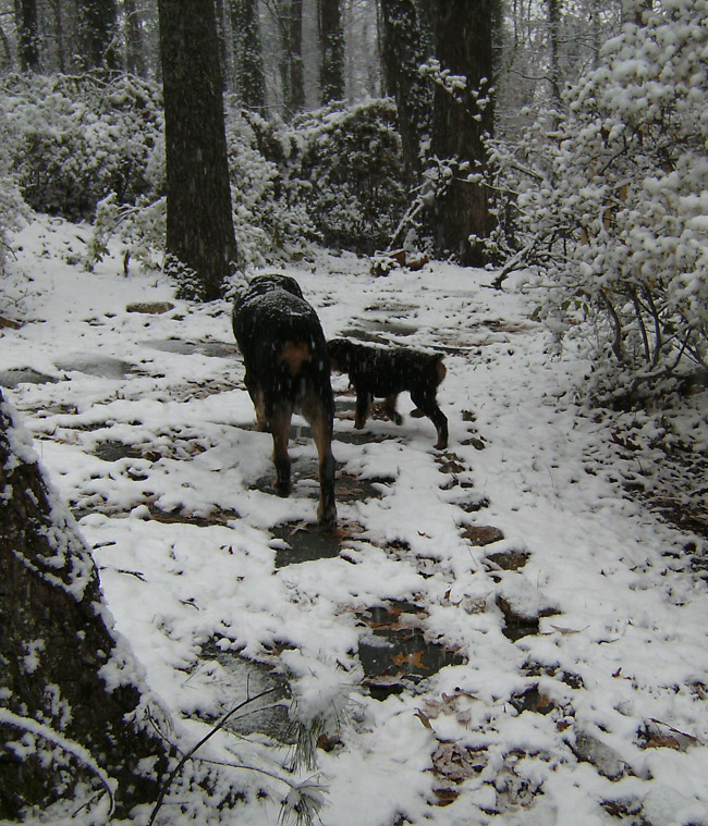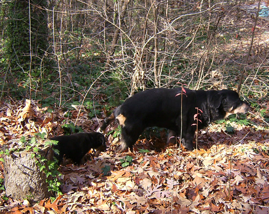 He does like the puppy, though.  They’ve formed a pack.  We have over an acre of fenced, wooded land and they’ll take off and roam their territory together.  At first, the puppy was a nuisance and Cutter allowed him to get close for no other reason than to poop on him.