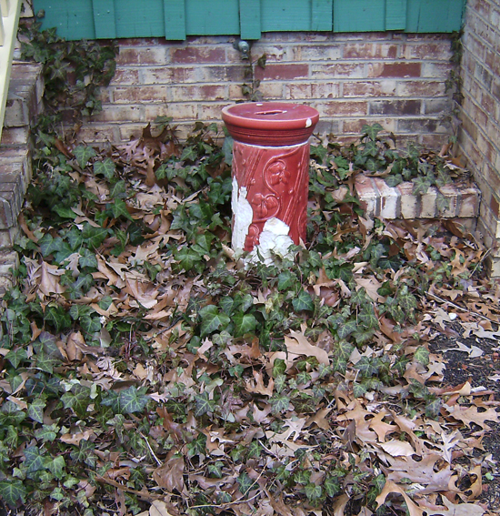 And I solved a puzzle while cleaning out this section. The red ceramic… item… covers the access plug to the French drains. We’d been looking for that; French drains need to be cleaned out every so often and it was nowhere to be found (why the drains are flush up against the house is a mystery of its own: most French drains are supposed to be set away from the property because, as we all know, when the Zombies reach the Sunflowers the game is all but over anyhow). The drain cover is, unfortunately, in about as bad of a shape as it looks and every time a rake or a foot banged into it, another piece of ceramic flaked off. I’m not sure where to buy a replacement – I didn’t even know decorative drain covers existed! – so it’ll stay there for the time being and I’ll keep an eye out for a hollow birdbath or something.