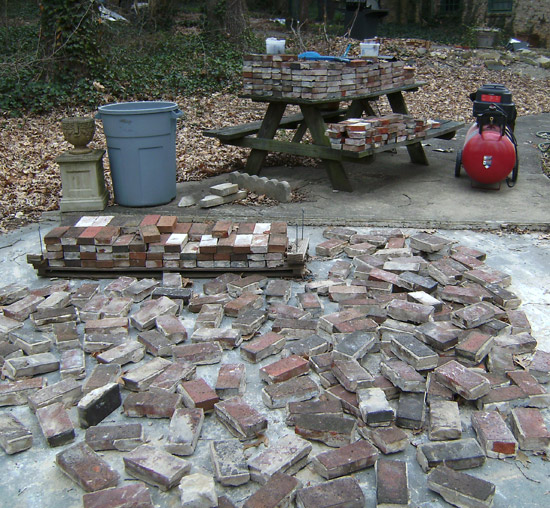 This brings me back to the summer of 2001: when the drum corps I was with had a free afternoon/day, most of us would get hauled out to the executive director’s house and help him chisel mortar off of bricks using hammer and chisel (or just hammer, there weren’t enough chisels). Find like 7-10 teenagers and tell them to do it. 🙂