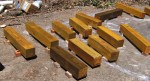 We use a 12″ drill bit to cut through the timber, and then pound it to the ground with 24″ metal spikes.