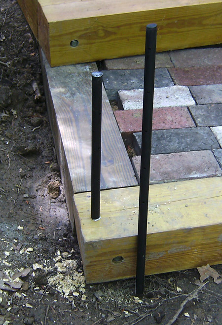 We found a good DIY stair plan in a book and adapted it slightly. The original plan called for a 6″x6″ wood frame with concrete in the center, but we have bricks — lots and lots of bricks — so the center of the frame was changed to accommodate pavers instead of brushed concrete. The rise of the garden slope was more shallow than what is required for typical stairs, so we lengthened each stair according to the “rule of 25” (a staircase will accommodate the average person’s natural stride if the height of two risers plus the depth of one tread equals 25) and went from there.