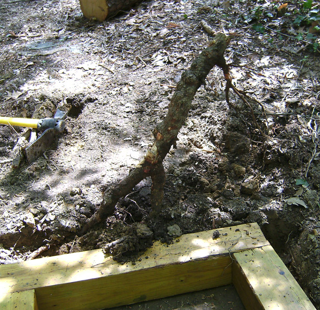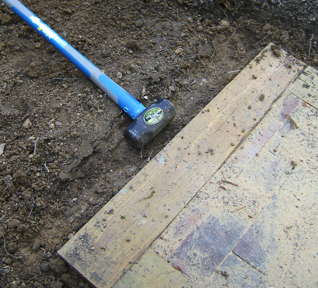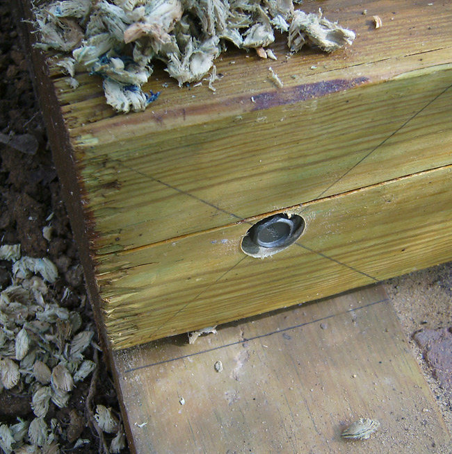 After the holes were drilled, we pounded 36″ spikes into them. At the completion of the project there will be four spikes on each frame, but as the two spikes at the back of each frame lock it to the preceding one, we are generally concerned only with the two at the front of the frame. In this instance, the spikes lock the front of Frame No. 3 to the back of Frame No. 2, and then travel down another two feet to hold both frames to the earth.