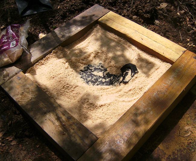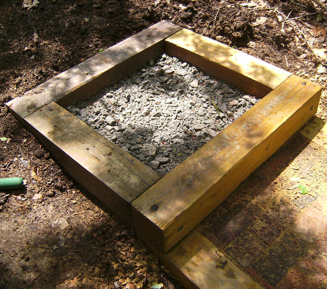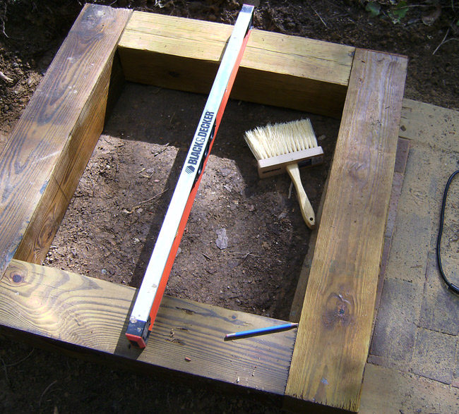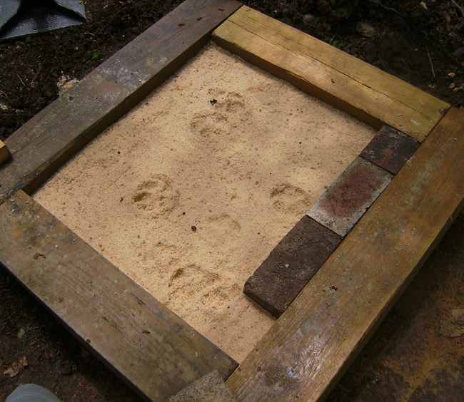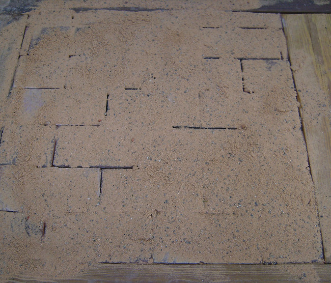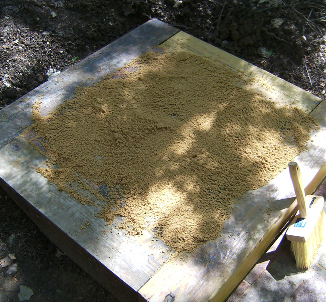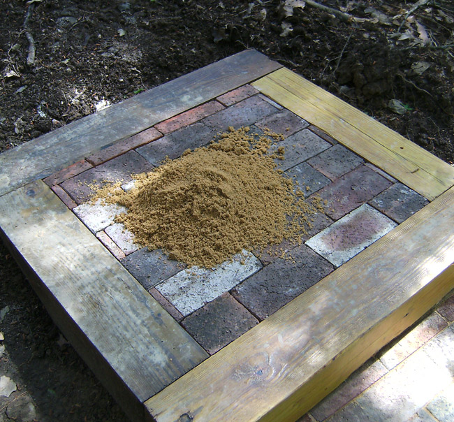 Seriously, at this point in the project the best thing you can do is grab your sledgehammer. Take it and start tapping (very gently) all four sides of the frame. Don’t hit the bricks. Just hit the outside of the wood frame and you’ll see the cracks between the bricks as the sand falls down. Do this as many times as you can. The purpose of sanding the bricks is to keep them from moving around, and to do this you have to wedge as much sand as possible between the cracks to get the bricks to stabilize. Paver sand in bags is typically damp; whether it’s shipped wet or it’s stored outside in garden centers and exposed to rain, I don’t know, but it’s usually moist when I crack the bag. Wet sand doesn’t want to get into cracks so you have to keep moving it around and tapping the frame until the sand dries and falls down between the bricks.