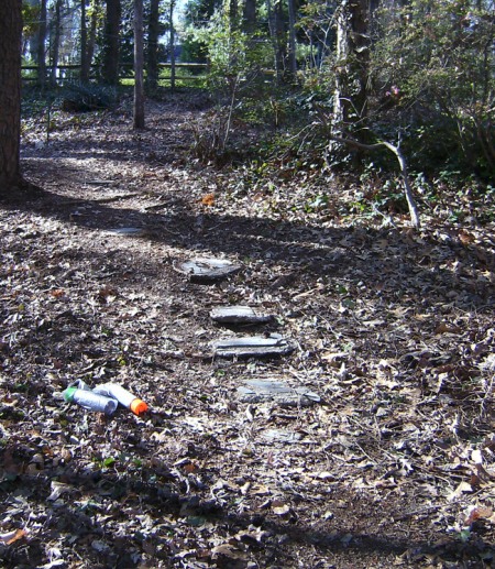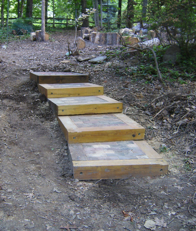 Five stairs done, and this weekend was spent building the last two frames.  The sixth is identical to these first five frames but the hill has run out of rise so the seventh is a double-length doozy, more of a short sidewalk than a stair.    We’re feeling good about the stairs and they look much better than the original slate-in-concrete nonsense (the middle stair is correctly aligned – the wood of the frame had a lopped edge and the shadow looks like a gap).  We’re ready for this project to be done, though.  These things are heavy.