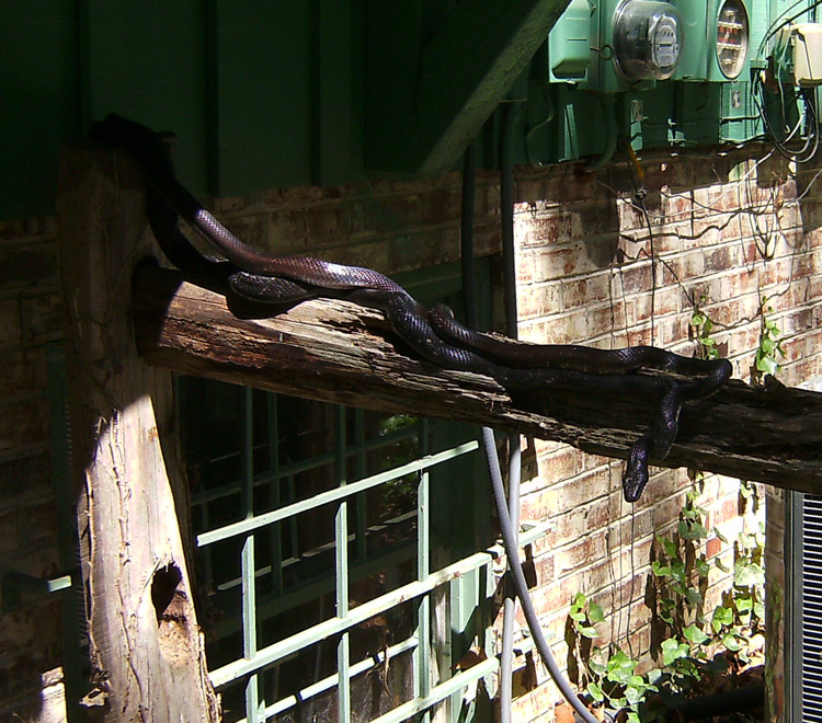 Allison and I were getting in her car when I saw a long shadow that hadn’t been there before, and upon coming closer we discovered that, no, the power line had not fallen in a disturbingly tangled fashion. Author’s note: if you absolutely have to trip over two five-foot-long snakes doing it, try to do so in the company of a woman who works at the poisonous snake exhibit at the North Carolina Zoo; Allison had them pegged as harmless black rat snakes before I was even sure they were snakes.*