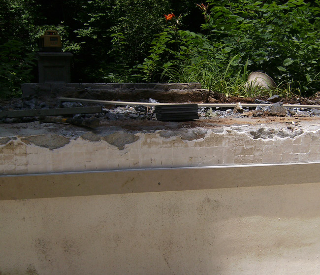 They persuaded us to go with 6″ tiles, which cover more space and create a tighter bond with the pool shell to minimize exposure to water. The grout is also a weather sealant, so cracking is less likely to occur. We packaged up the old tile for later; we can use it under the waterline as a decoration when we do the second round of pool renovations in a few years.