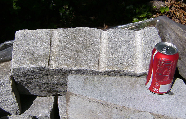 Four pallets arrived today. The first is concrete slabs to be used with the fence project; more on that later. The other three are as much reclaimed granite as I could get my hands on, with an extra half-ton of stone in various reds, golds, and blues. And check out these sexy, sexy tool marks!