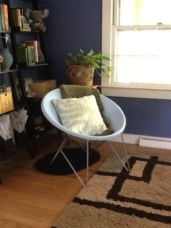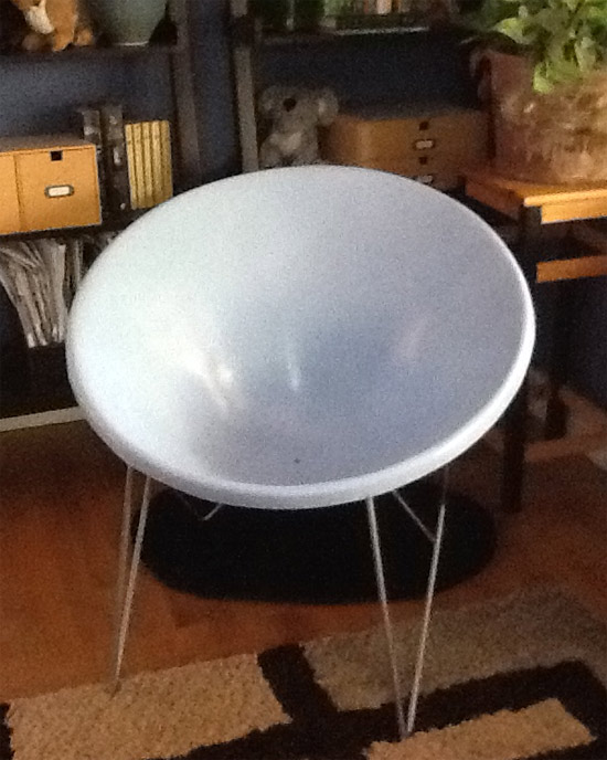 We lived within walking distance from the country club, if you consider three-and-a-half miles walking distance.  If the schedules didn’t line up for a drop off or a pick up, I walked.  That day, I walked home with a retro fiberglass bowl chair.  The chair came with me through college and multiple moves.  It had been languishing at our friends Steve and Allison’s place for several years now, as Brown and I had moved out of there when we bought our house and we had just never gotten around to reclaiming it.  So I woke up yesterday morning and found a This: