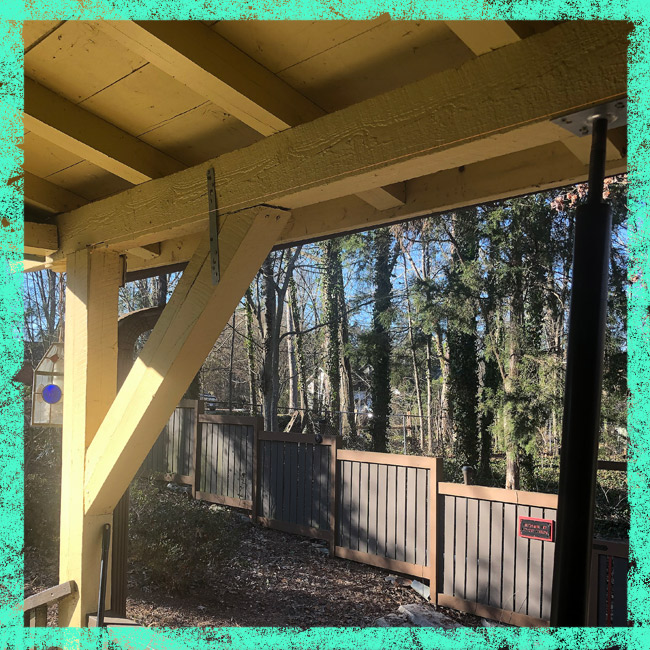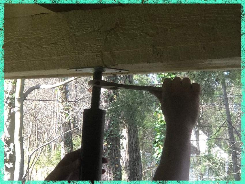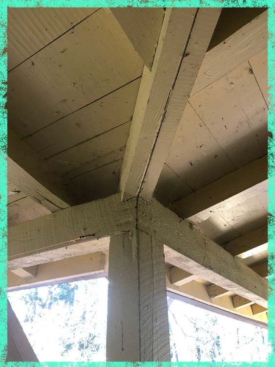 The porch was caving in. One of the main beams had been sistered together but didn’t have a support post beneath the joint. The wood itself was sixty years old, and rot was everywhere but had been painted over to conceal it. The roofing company recommended a structural engineer to come out and do a thorough review. His final report was basically, “Welp,” and he said that as the house roof and the porch roof were part of the whole, we needed to bring the porch roof back to level before we could make full repairs. This process is best described as house braces, where three poles were positioned under the drooping parts and were gradually brought back to level by turning them a quarter-inch every month. So we put up the poles and I went up on the roof with a bucket of fresh sealant before the hurricanes.